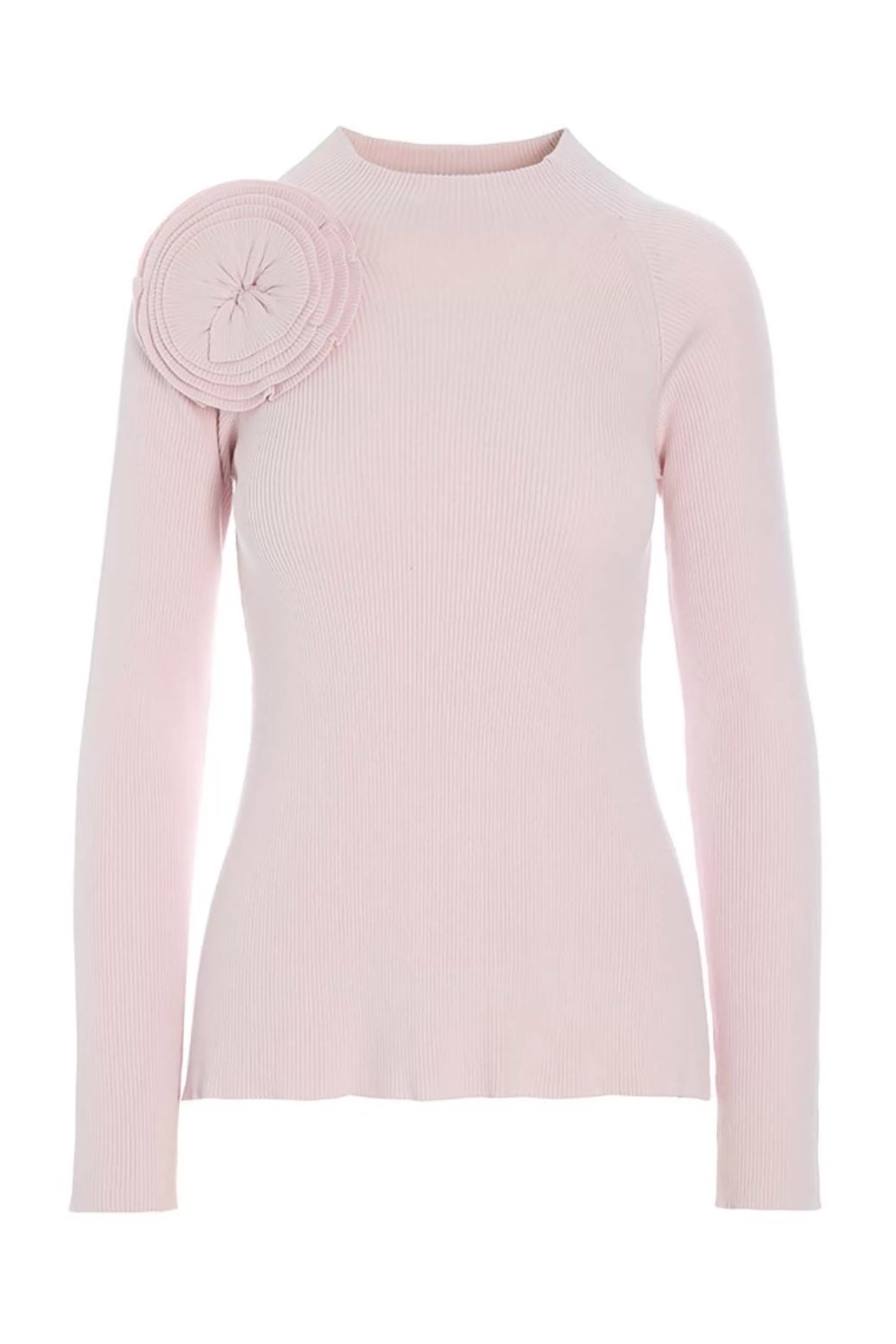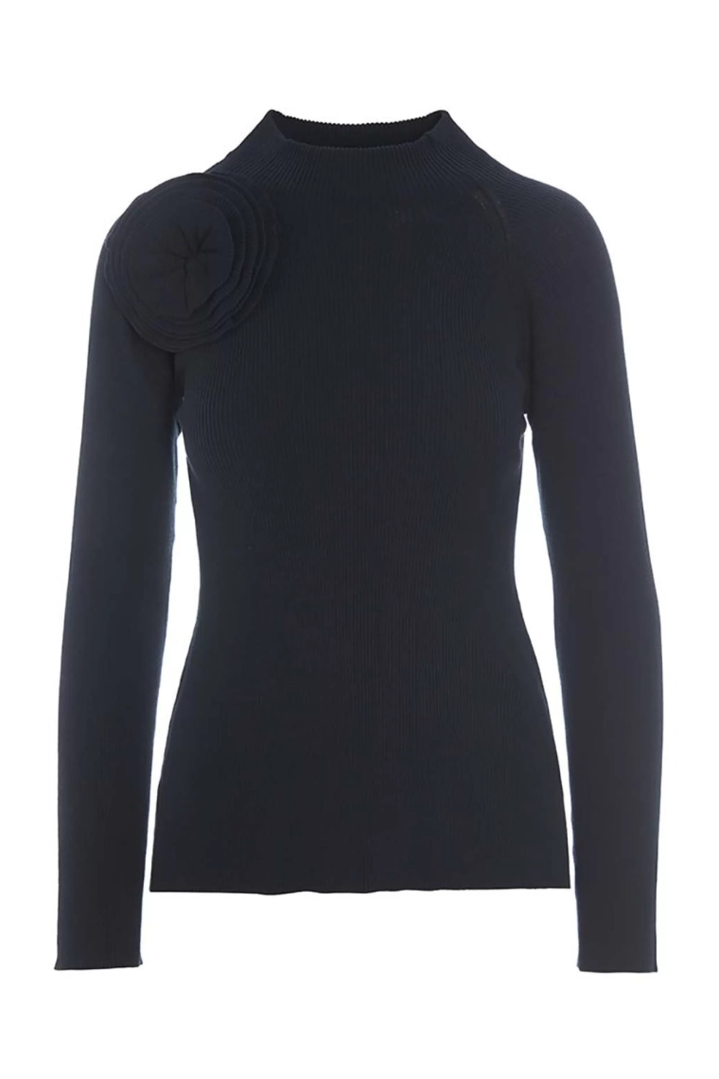 Strikbluse med rib og den fineste matchende blomst som dekoration. Blusen er relativt tætsiddende, og når ribstrikken …