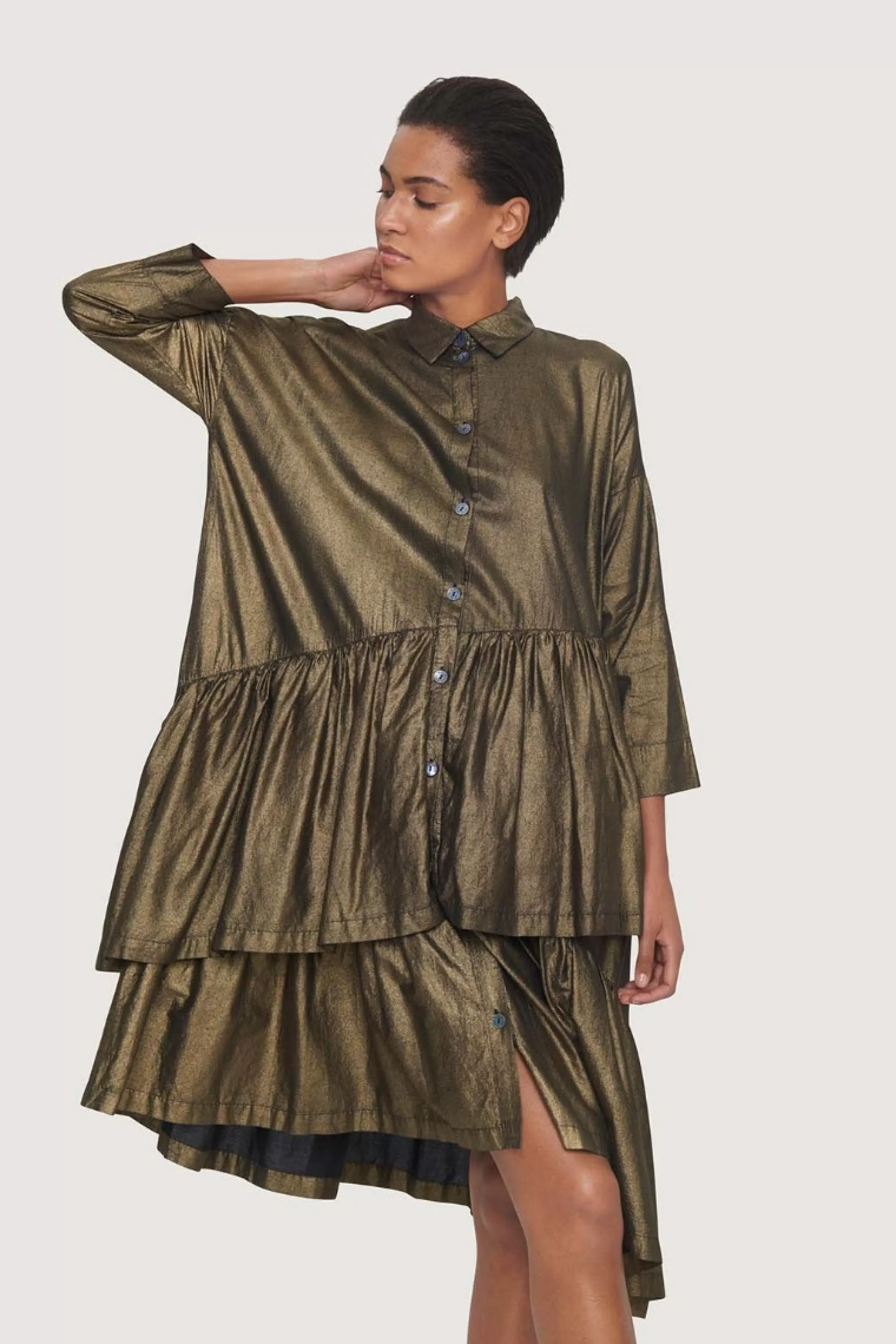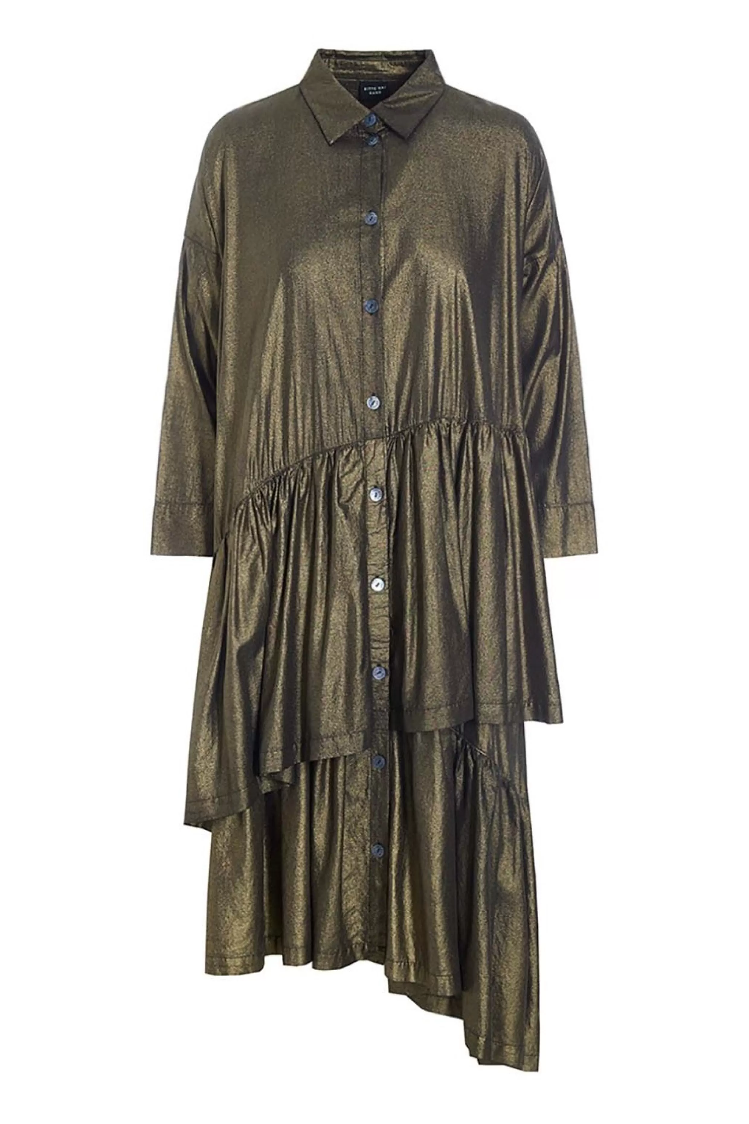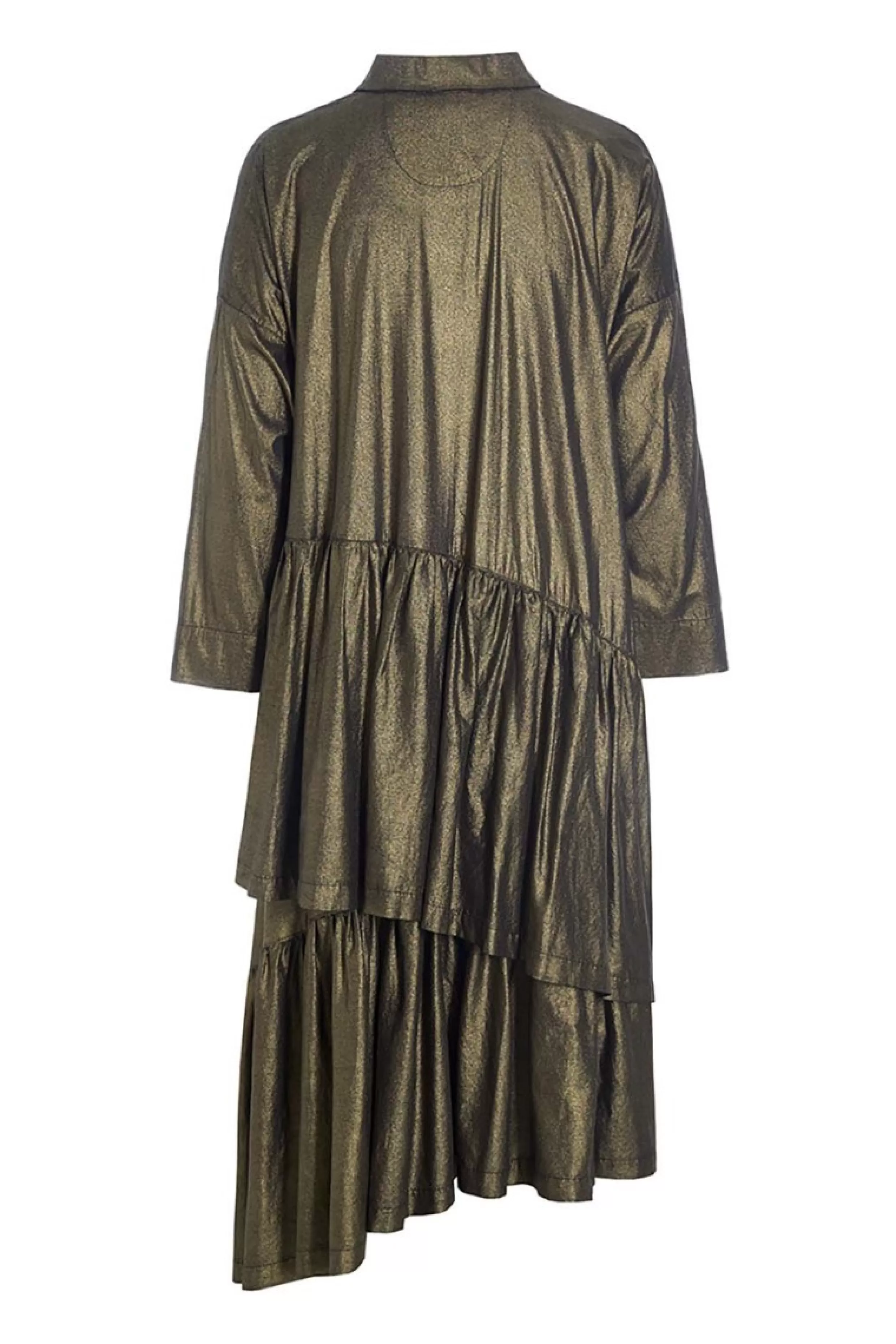 Kjolen er produceret i et lækkert metallic folieprintet stof og forsynet med to brede assymetriske flæser rundt om kroppen. Der er masser af volumen i skørtet, som falder utrolig smukt. Med denne kjole behøver du ikke andet end et par flotte sko, så er du opsigtsvækkende, elegant og lækkert klædt.Modellen på billede er 180 cm og iført str. SFuld længde i str. S, ca. 110 cm.